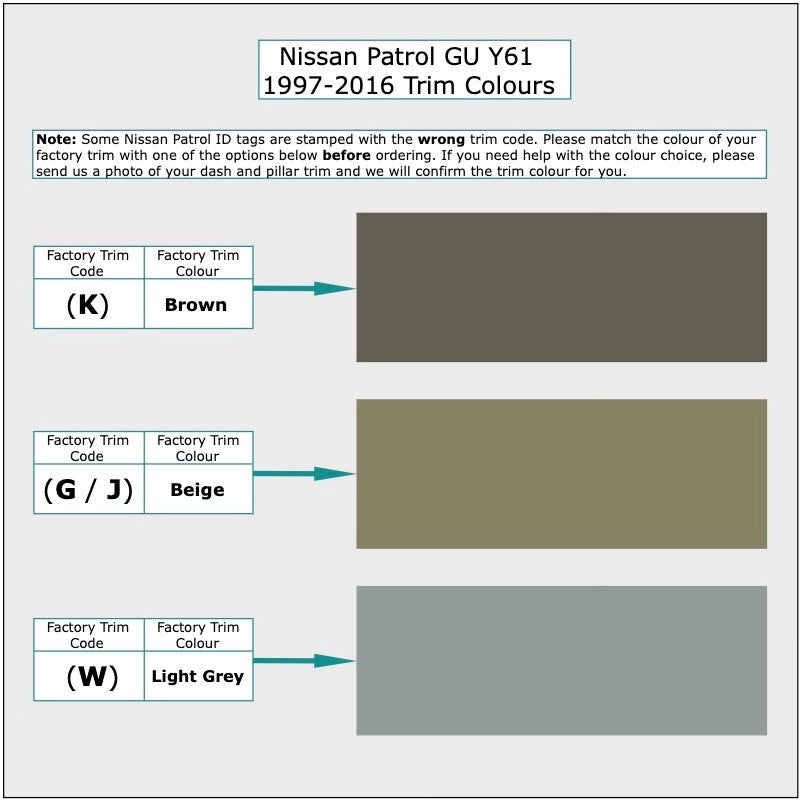 Nissan Patrol GU Triple Gauge Pillar Pod Trim colour - G (Beige) PLEASE DOUBLE CHECK YOUR VEHICLE ID TAG AND YOUR PILLAR TRIM COLOUR AS YOUR VEHICLE ID TAG COULD BE WRONG. FOR MORE INFOMATION PLEASE REFER TO THE TRIM COLOUR CHART IN THE PHOTOS. GU PATROLS CAME OUT WITH THREE DIFFERENT TRIM COLOURS GREY, BEIGE AND BROWN. • Fits all right hand drive GU Patrol’s from 1997 - 2016. • Fits 3x 52mm gauges up to 75mm deep. • The surface finish is the closest to the factory trim available. Please note there may be a slight colour difference in the trim colour due to vehicle age, sun exposure and other factors outside our control. • Replaces the factory pillar trim and is held in place by the factory grab handle, no cutting or drilling required. • The item picture you see is what you get.. • Free post Australia wide, NO pick up’s!. • International postage is available. |