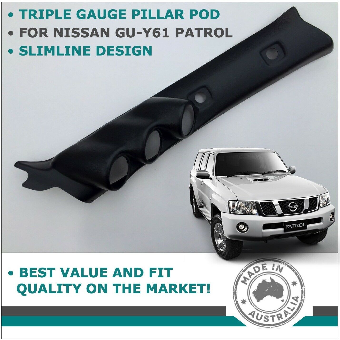 Nissan Patrol GU Triple Gauge Pillar Pod • Fits all right hand drive GU Patrol’s from 1997 - 2016. • Fits 3x 52mm gauges up to 75mm deep. • The surface finish is the closest to the factory trim available and is very easy to paint, supplied in Black only! • Replaces the factory pillar trim and is held in place by the factory grab handle, no cutting or drilling required. • The item picture you see is what you get. • Free post Australia wide, NO pick up’s!. • International postage is available. |